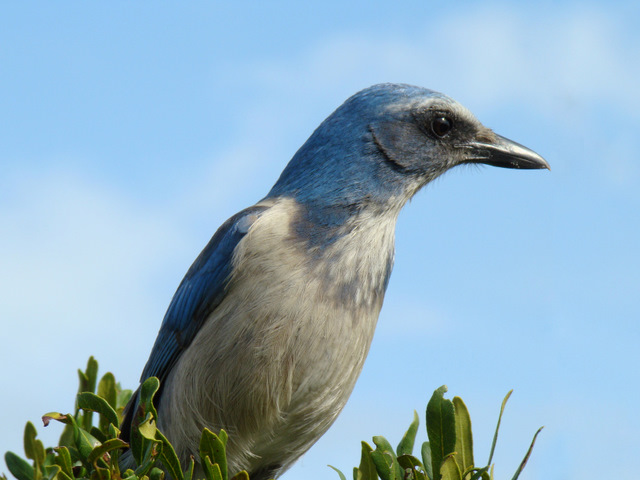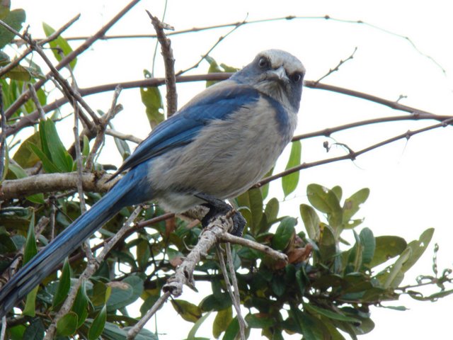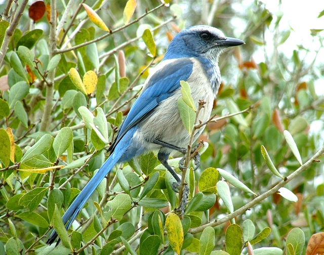 The Florida Scrub Jay The Florida scrub-jay is a 12-inch-long, blue and gray crestless jay that lacks the white wing spots and tail feather tips of the more common and widespread blue jay. A necklace of blue feathers separates the whiter throat from the gray whitish forehead. The tail is long and loose in appearance, and the back is gray. Scrub-jays that are less than about 5 months old can be identified by their dusky brown head and neck, but there are no such physical traits that distinguish males from females. Florida scrub-jays mate for life. They nest in March